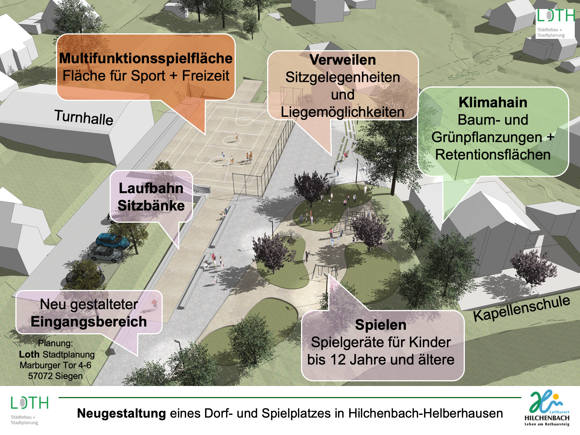 Die Aufgabe der Nutzung der ehem. Kapellenschule und die Transformation zu einem Bürgertreff nehmen ebenso Einfluss auf die Attraktivität der Ortsmitte wie der stark sanierungsbedürftige Bolzplatz, der öffentlich zugänglich auch vom TSG Helberhausen für den Freizeitsport genutzt wird.